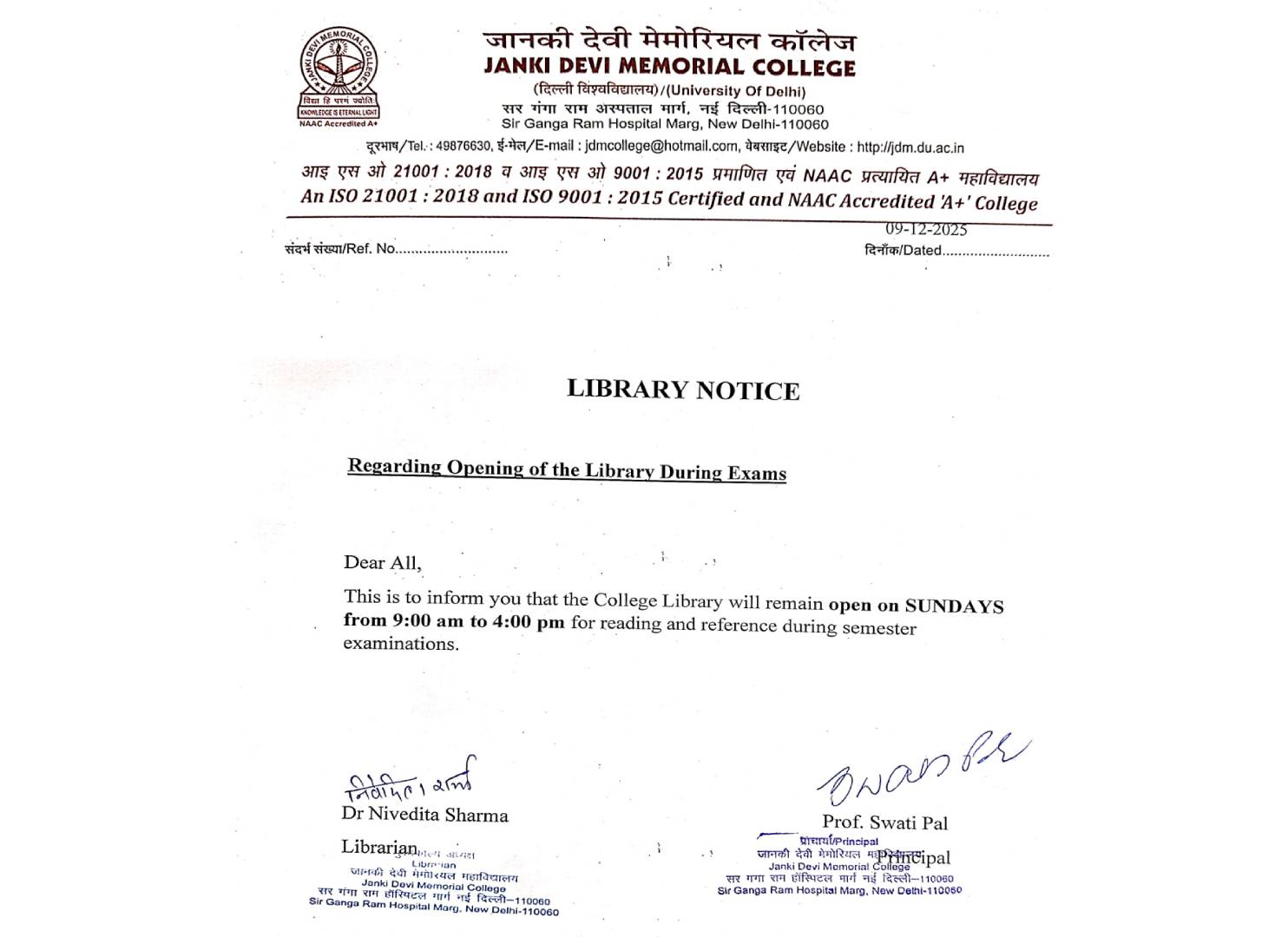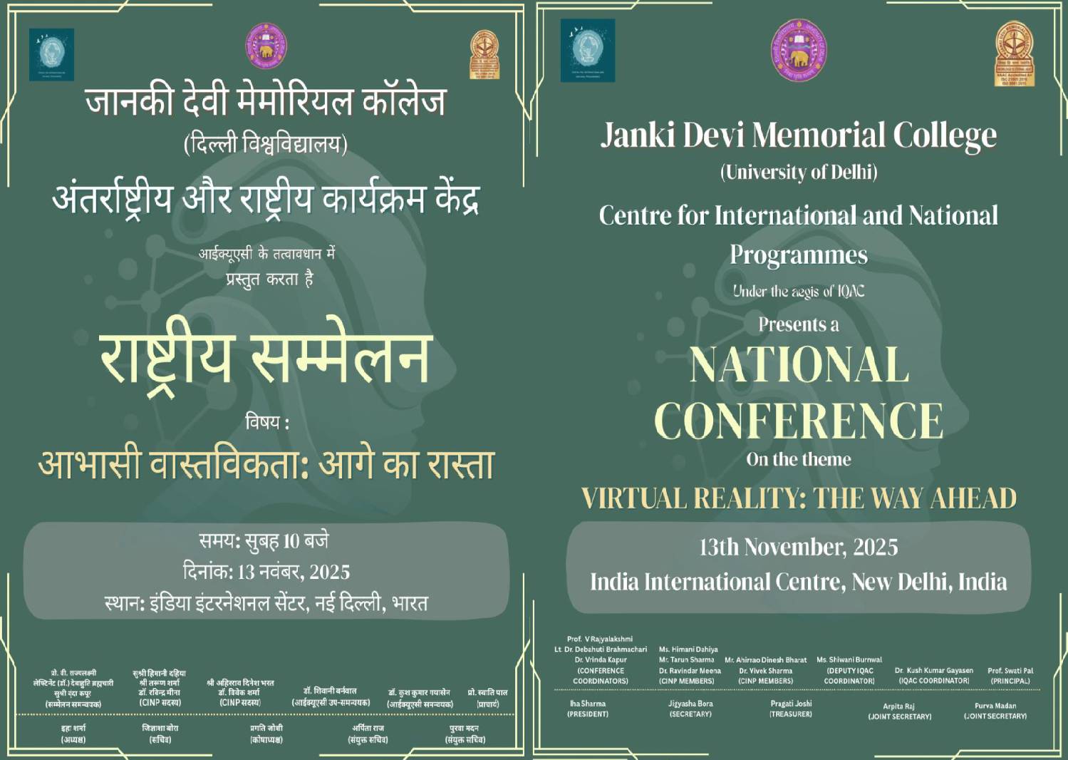 Janki Devi Memorial College, is an A+ NAAC accredited and ISO 21001: 2018 and 9001: 2015 certified premier women’s college of the University of Delhi. The Institution was founded in 1959 by the famous Gandhian Shri Brij Krishan Chandiwala in memory of his mother Smt. Janki Devi.