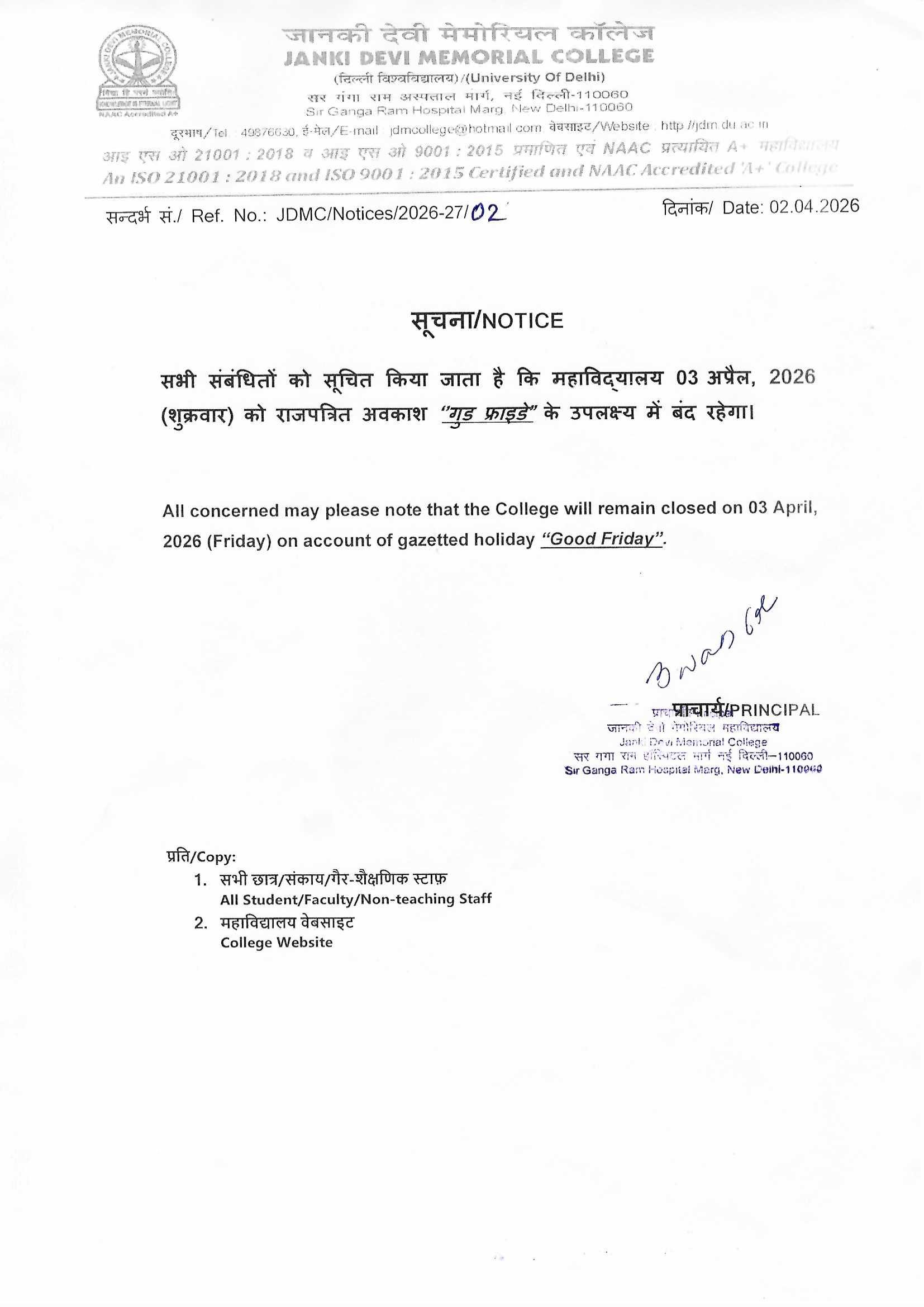 » Notice for Holiday on 27th March 2026