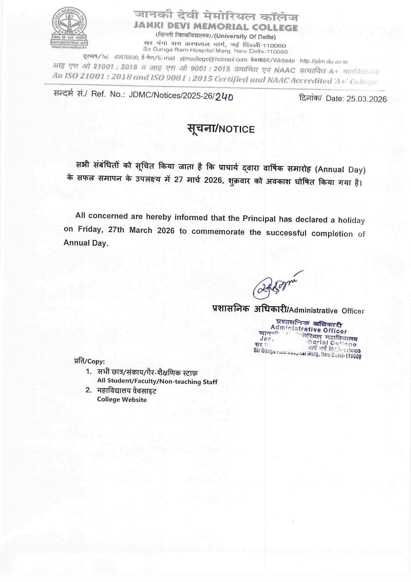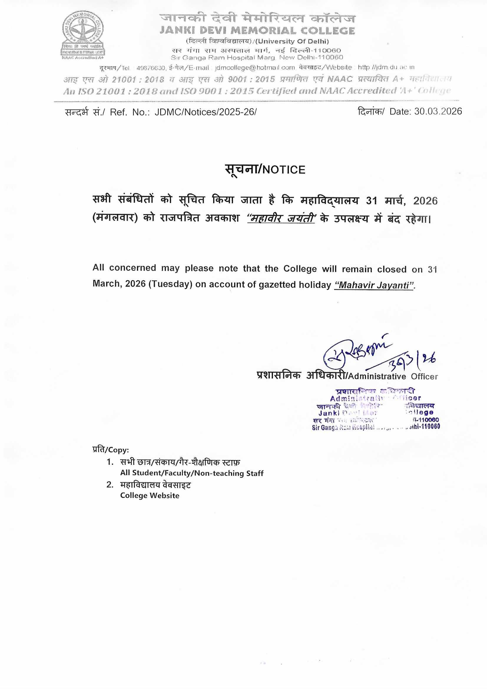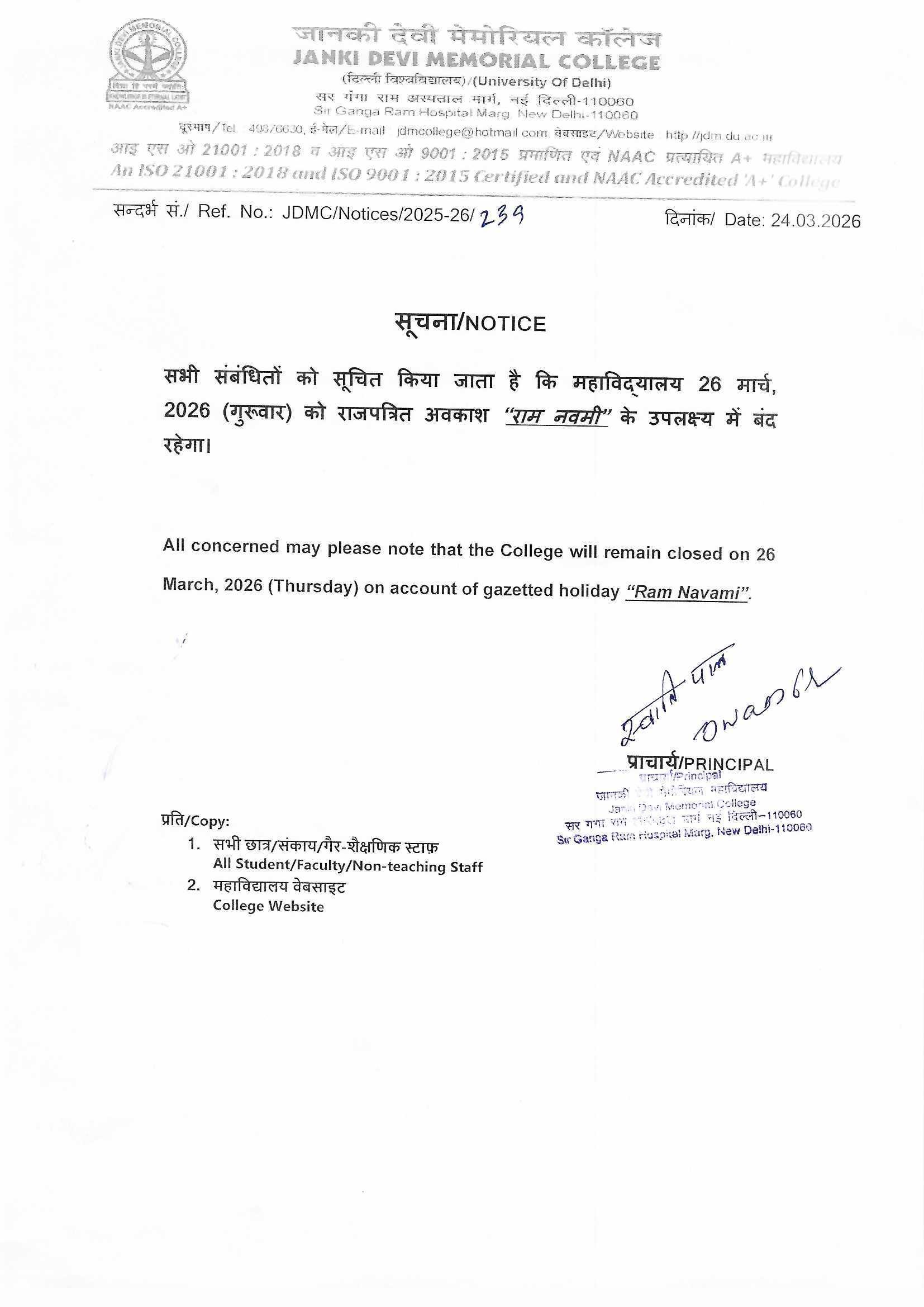 » Notice for Holiday on 26th March, 2026