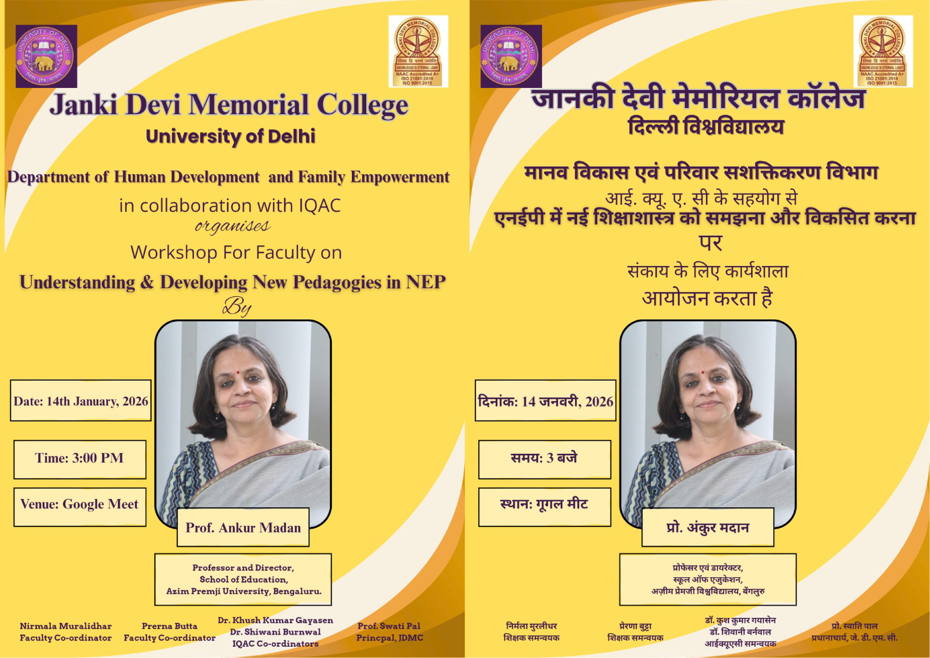 Warm welcome to Janki Devi Memorial College, University of Delhi! I am delighted that you are now a part of the JDMC family and I look forward to your active engagement with the college, your constructive suggestions to set new benchmarks and your participation in helping the college to attain the same.