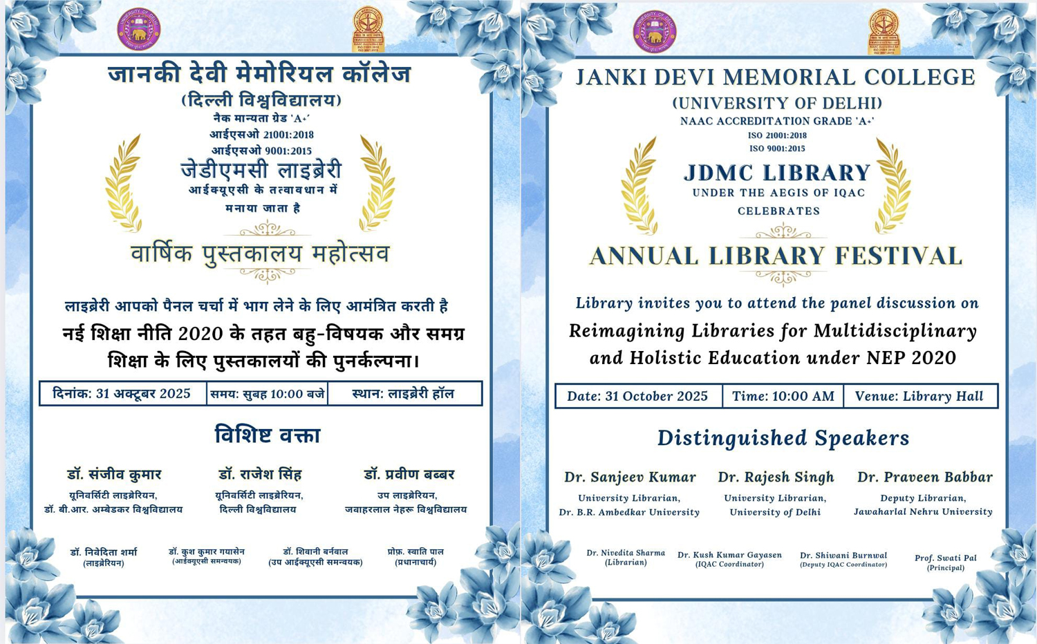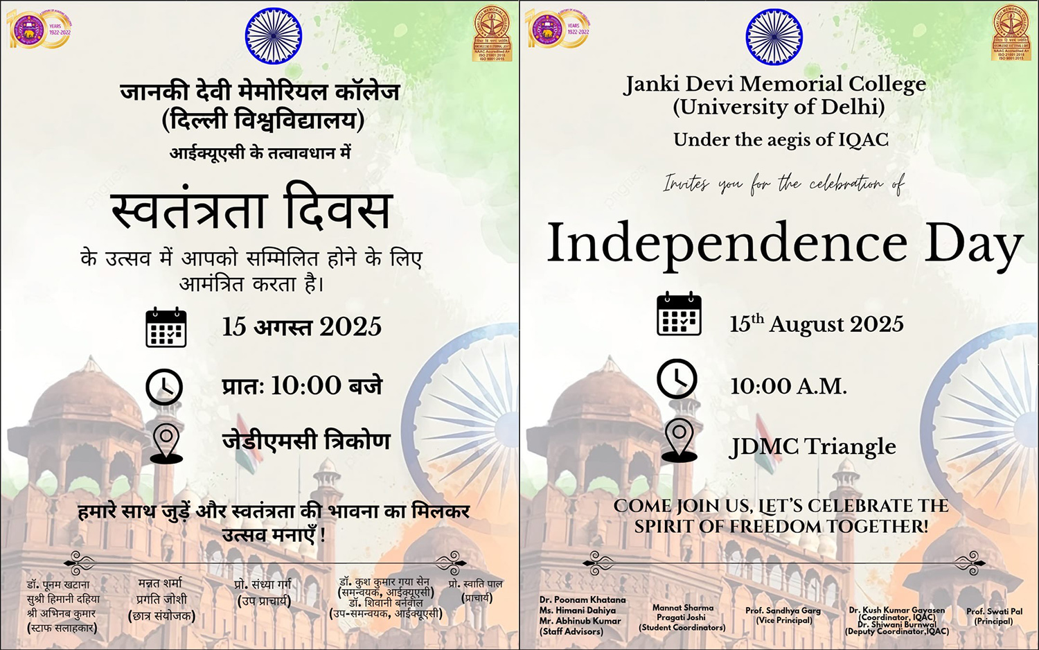 Janki Devi Memorial College, is an A+ NAAC accredited and ISO 21001: 2018 and 9001: 2015 certified premier women’s college of the University of Delhi. The Institution was founded in 1959 by the famous Gandhian Shri Brij Krishan Chandiwala in memory of his mother Smt. Janki Devi.