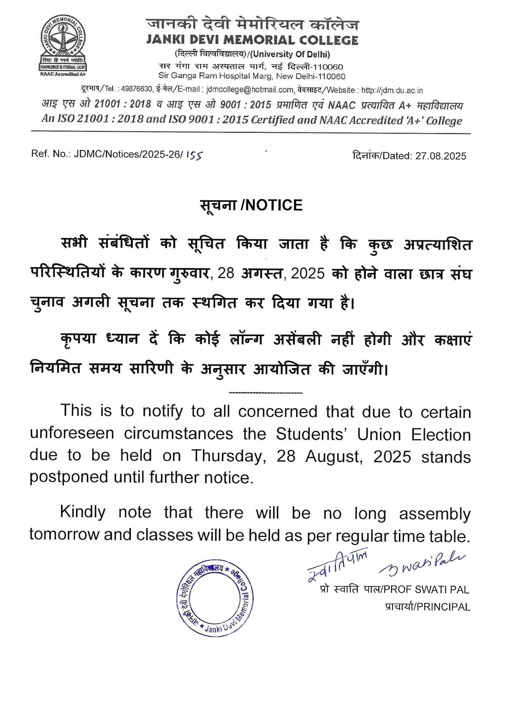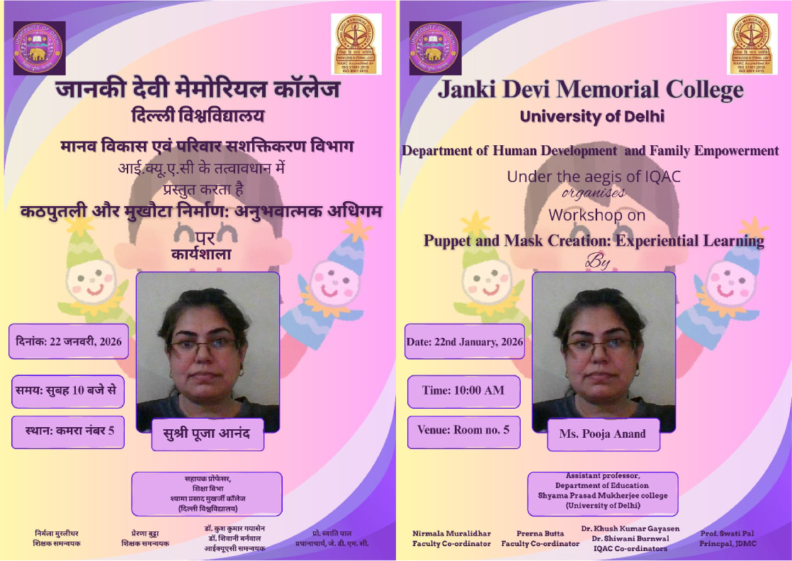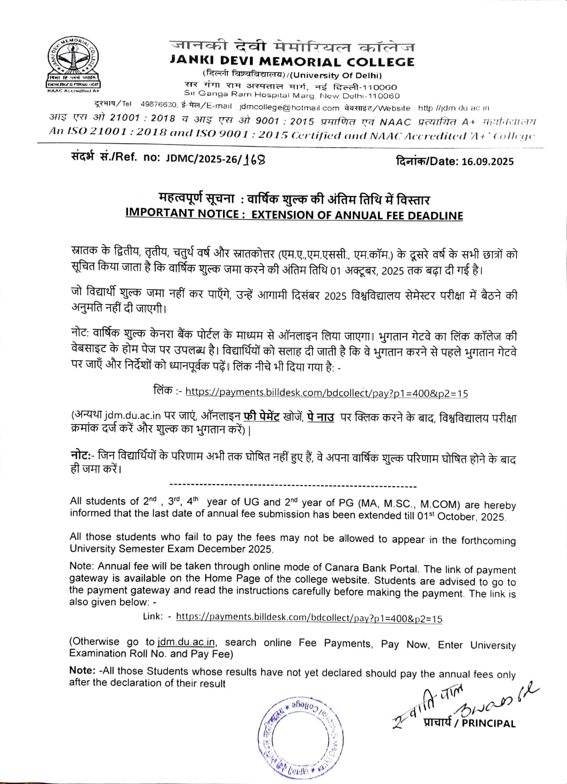 Warm welcome to Janki Devi Memorial College, University of Delhi! I am delighted that you are now a part of the JDMC family and I look forward to your active engagement with the college, your constructive suggestions to set new benchmarks and your participation in helping the college to attain the same.