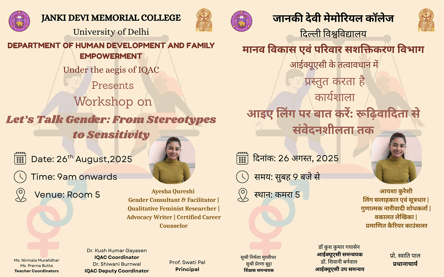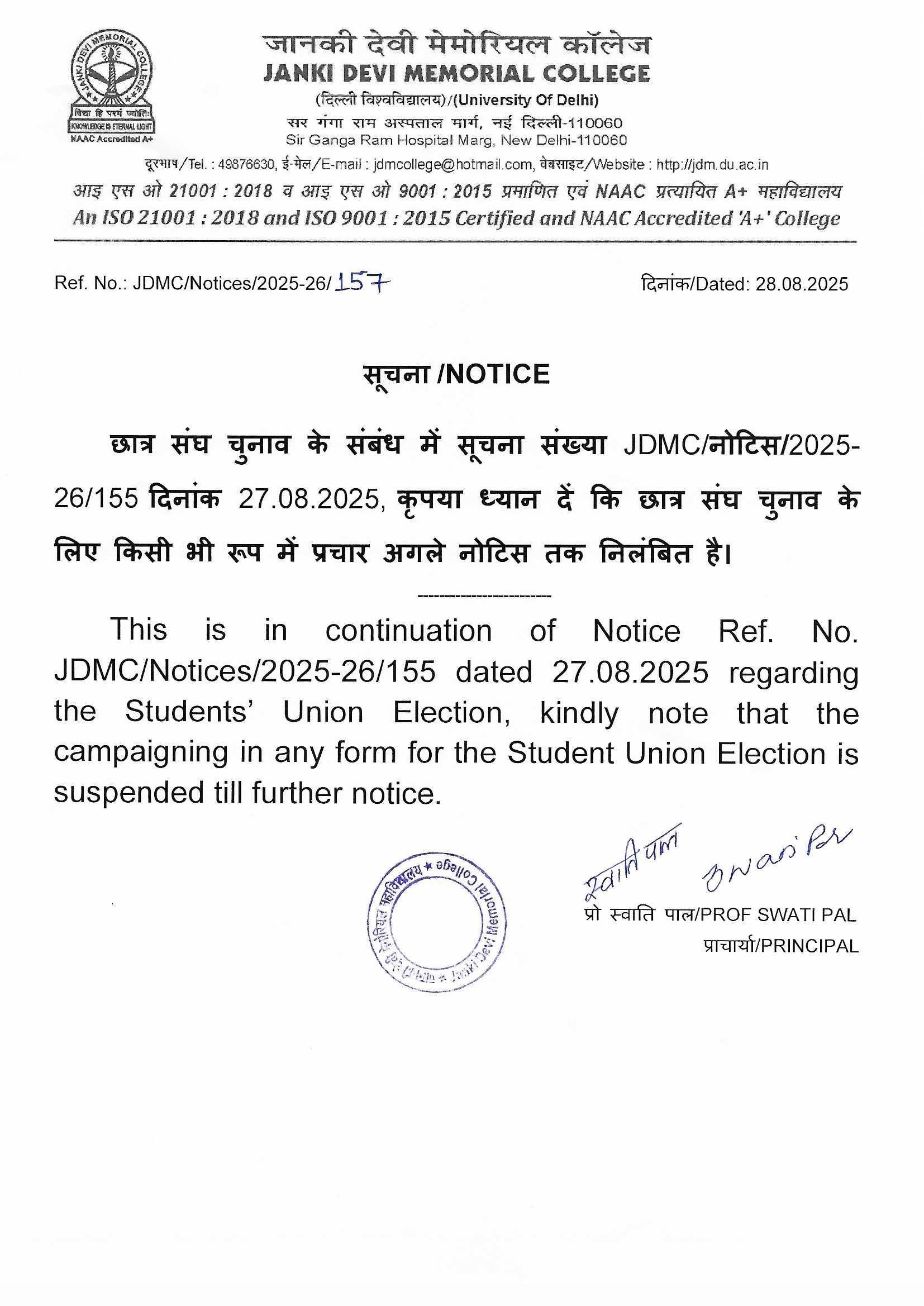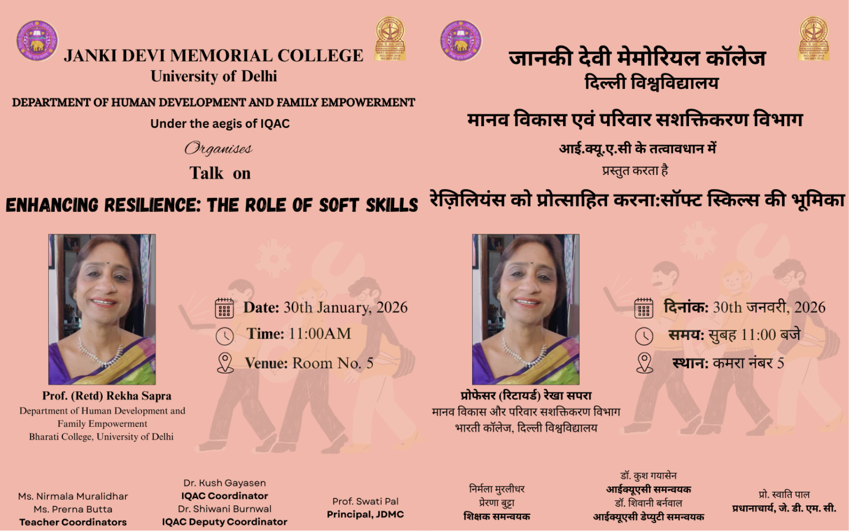 Warm welcome to Janki Devi Memorial College, University of Delhi! I am delighted that you are now a part of the JDMC family and I look forward to your active engagement with the college, your constructive suggestions to set new benchmarks and your participation in helping the college to attain the same.