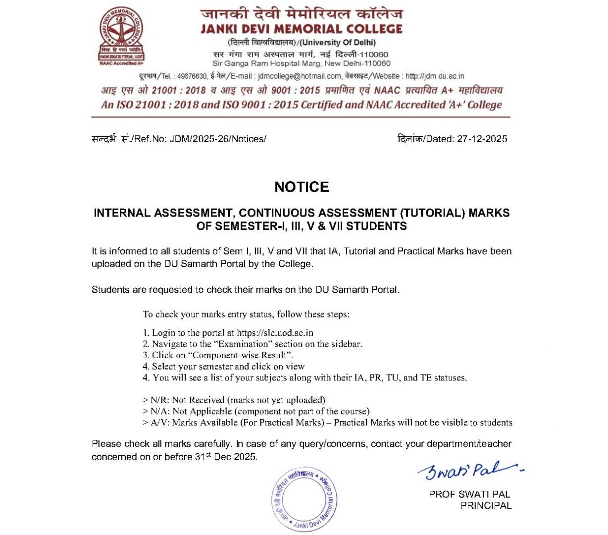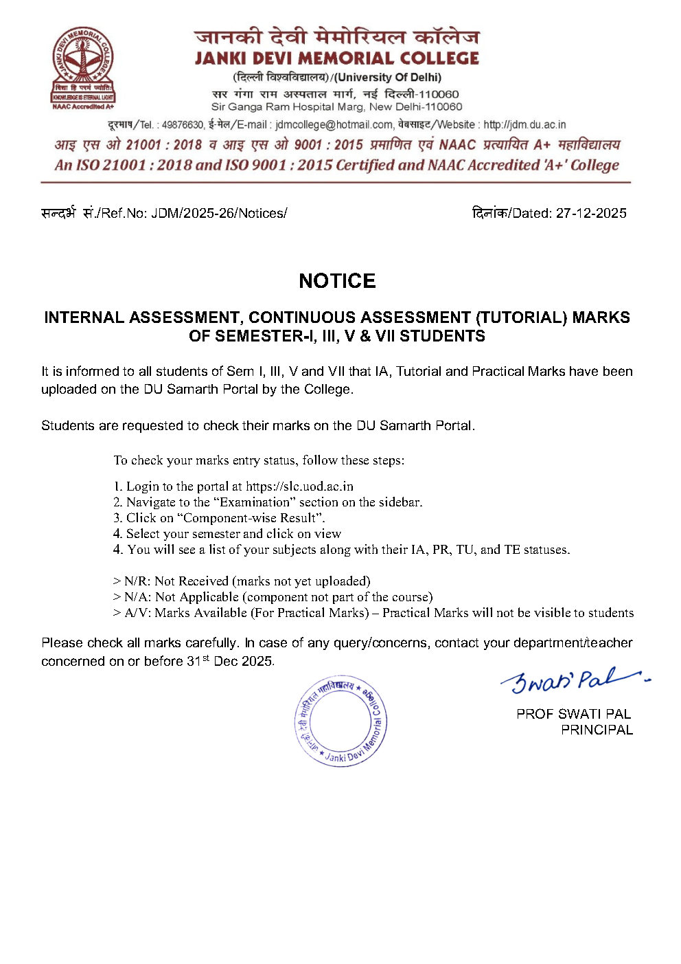 » Notice for students for Internal Assessment, Tutorial and Practical Awards for Semester Exam-Dec 2025