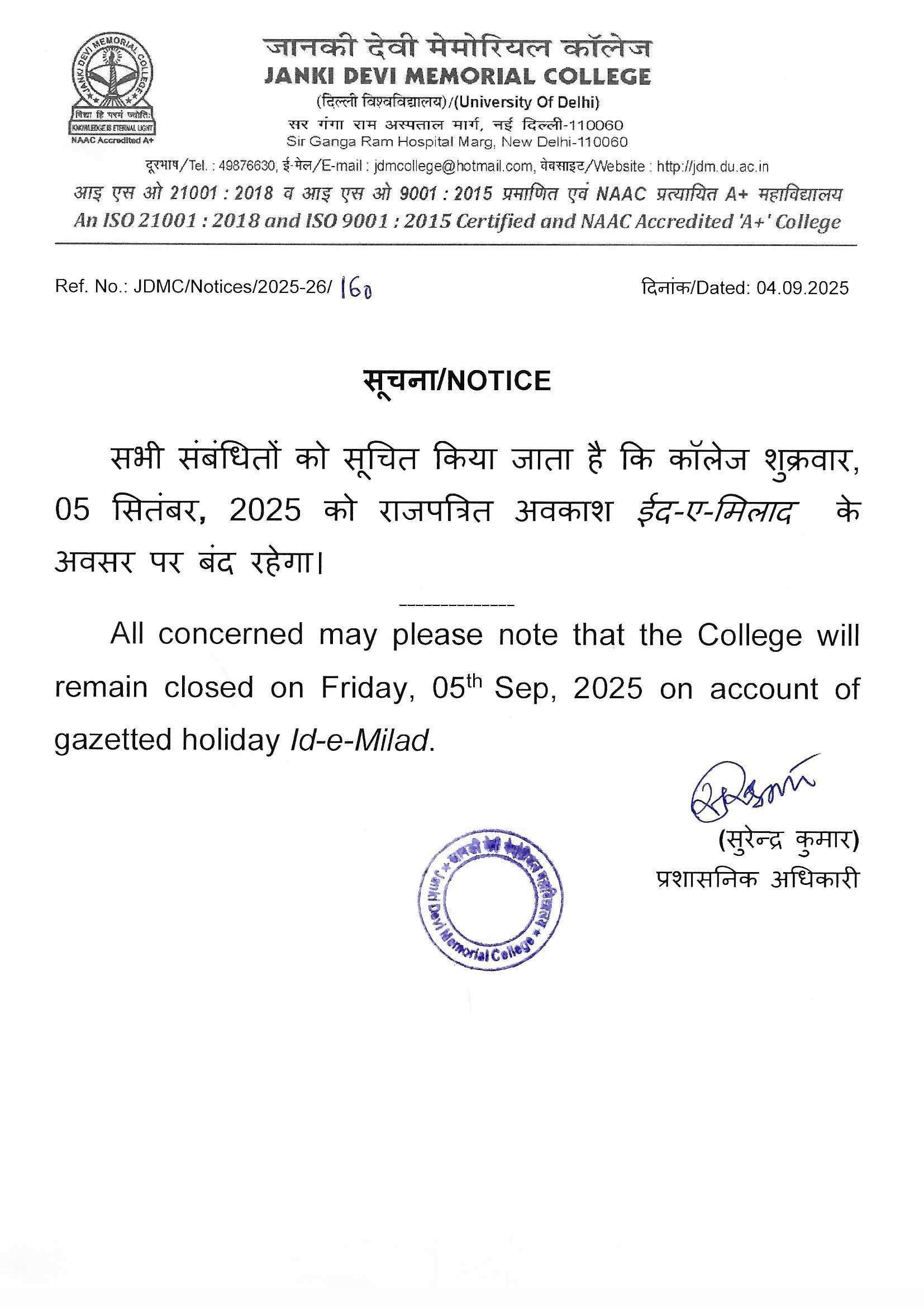» Notice for Holiday on Friday 05.09.2025