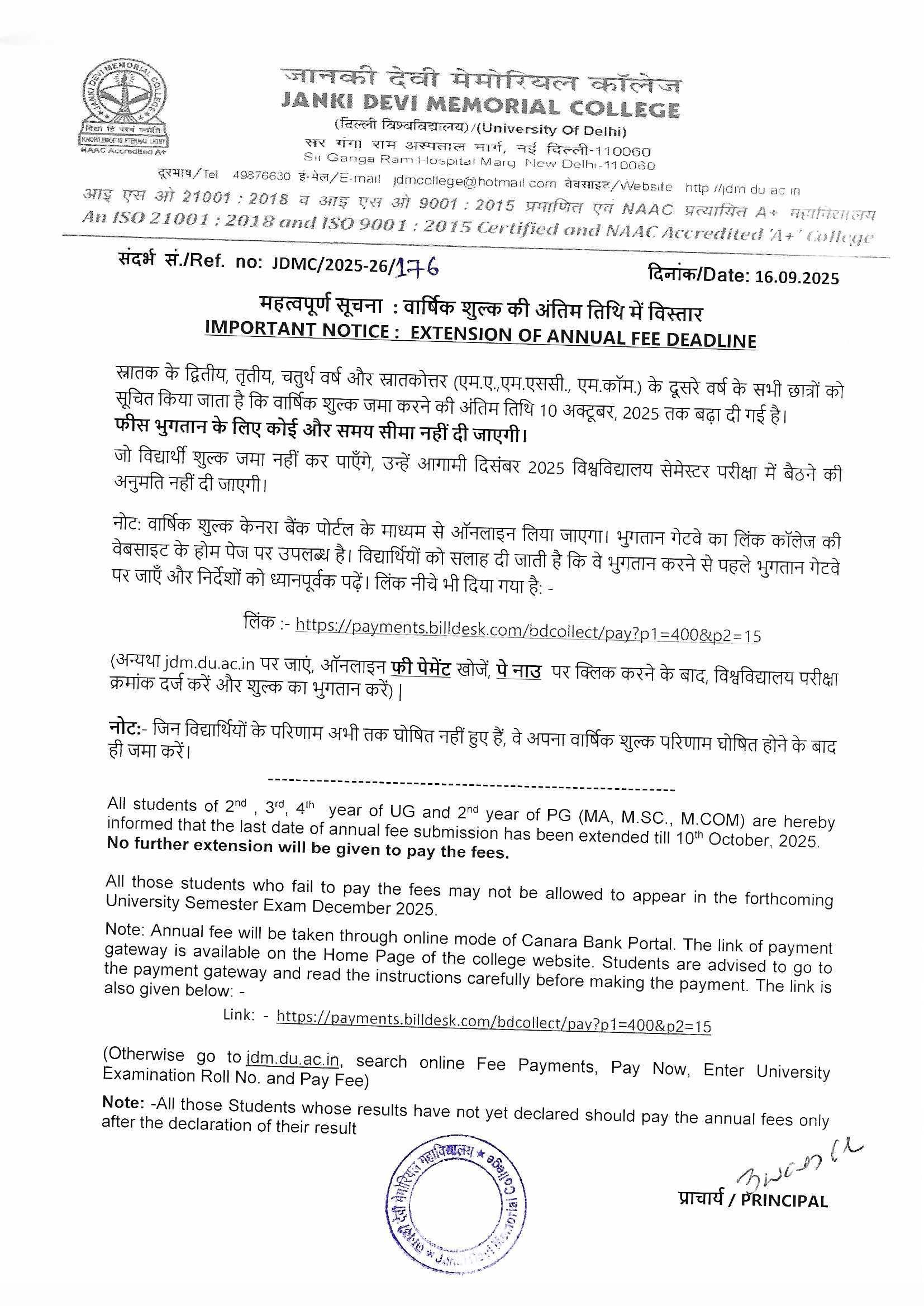 » Notice for extension of date for payment of college fees