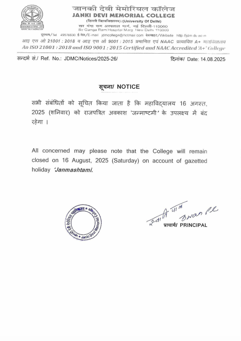 » Notice for Holiday on 16 August, 2025