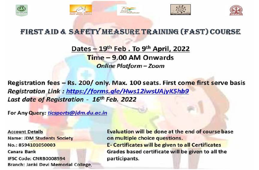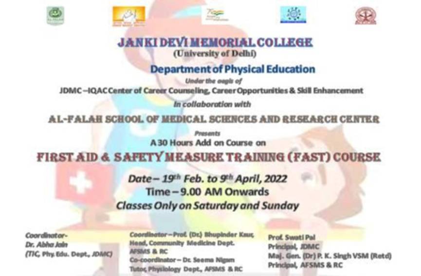First Aid and Safety Measures Training (FAST) Course for all students of JDMC, specifically for sports girls to help them develop soft skills and deal with any emergency on road, public place or at home in collaboration with Alfalah School of Medical Sciences and Research Centre, Dhauj, Faridabad, Haryana in February 2022.